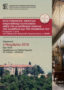 Την Παρασκευή 4 Νοεμβρίου και ώρα 16.οο, στο αμφιθέατρο της Παλιάς Νομικής, στην Κομοτηνή, διοργανώνεται από το Τμήμα Ιστορίας και Εθνολογίας επιστημονική ημερίδα με θέμα την ιστορία και την προσφορά του Οικουμενικού Πατριαρχείου.