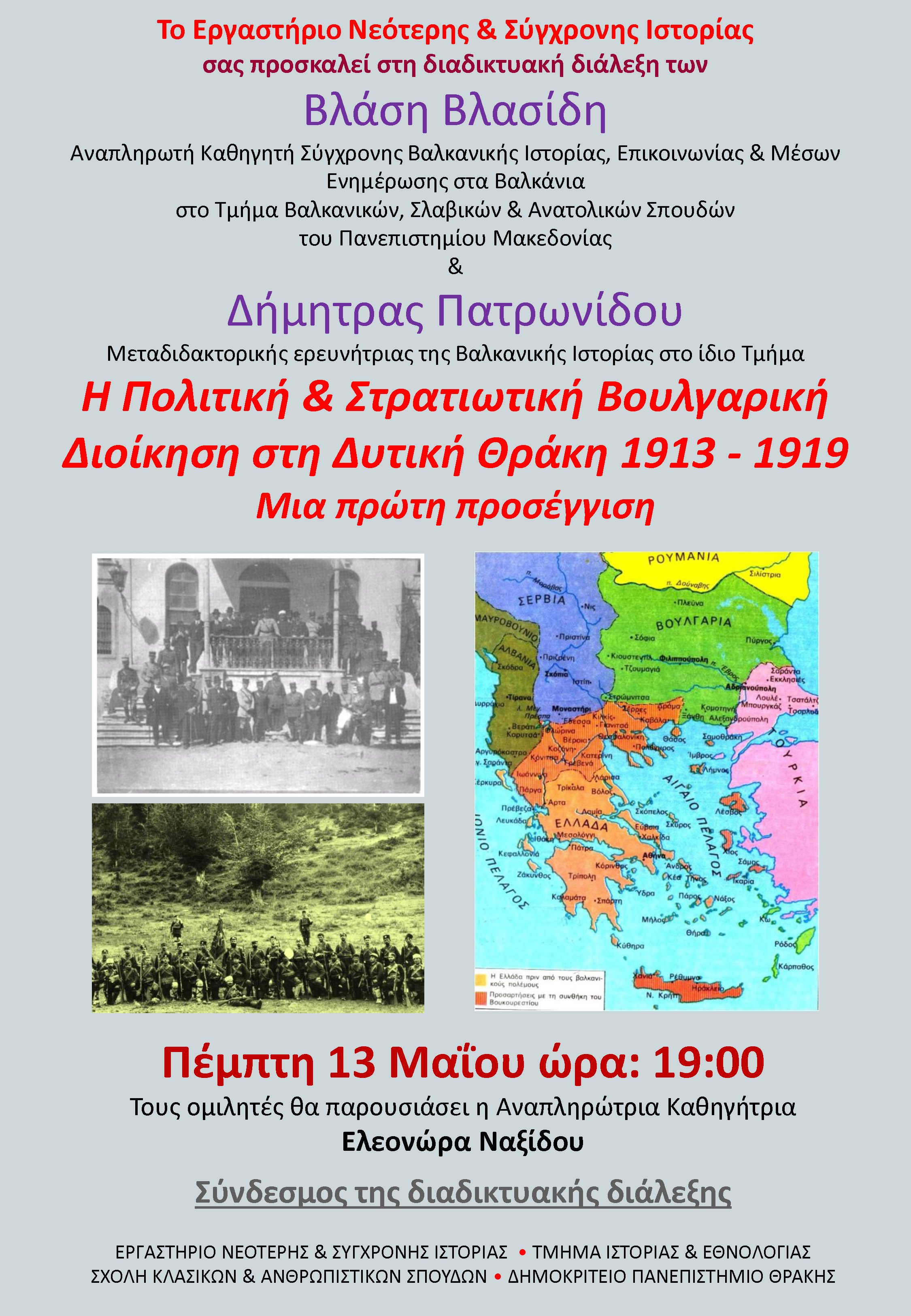 Στο πλαίσιο των εκδηλώσεων του Εργαστηρίου Νεότερης και Σύγχρονης Ιστορίας του Τμήματος Ιστορίας και Εθνολογίας του Δημοκρίτειου Πανεπιστημίου Θράκης, θα πραγματοποιηθεί την Πέμπτη 13 Μαΐου 2021 και ώρα 19:00 διαδικτυακή διάλεξη των κ. Βλάση Βλασίδη, Αναπληρωτή Καθηγητή και της κας Δήμητρας Πατρωνίδου, Μεταδιδακτορικής ερευνήτριας με θέμα: Η Πολιτική & Στρατιωτική Βουλγαρική Διοίκηση στη Δυτική Θράκη 1913 - 1919. Μια πρώτη προσέγγιση.