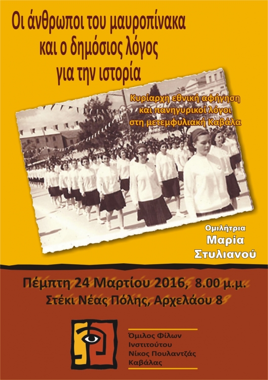 Διάλεξη της κ. Μ. Στυλιανού με θέμα 'Κυρίαρχη εθνική αφήγηση και πανηγυρικοί λόγοι στη μετεμφυλιακή Καβάλα', 24.3.16.