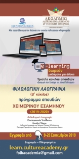 β) έως 28/9/2019 για το Γ’ εξάμηνο «Φιλολογική Λαογραφία, β κύκλος», για το Χειμερινό εξάμηνο 2019-20 που θα προσφερθεί εξ αποστάσεως.