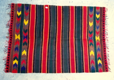 Μάλλινο υφαντό κιλίμι με ενυφασμένη πολύχρωμη διακόσμηση σε ρίγες.Φέρει κροσσωτή απόληξη.
