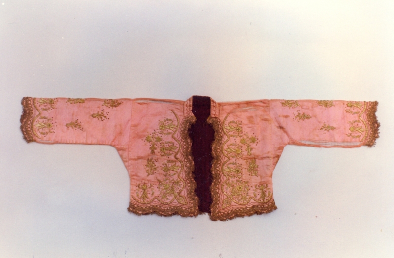 Μεταξωτό ζακέτο.Αποτελείται από ένα κομμάτι ύφασμα μπρος-πίσω με κατακόρυφο άνοιγμα μπροστά γαρνιρισμένο ολόγυρα και στη βάση του με γλωσσωτό χρυσό σειρήτι με το οποίο διακοσμείται και ο γύρος των μανικιών. Το μπροστινό μέρος πλούσια διακοσμημένο με ανθικά μοτίβα δουλεμένα με χρυσοκλωστή και πούλιες. Αρμενία (;)