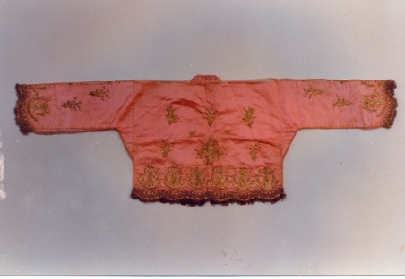 Μεταξωτό ζακέτο. Πλούσια διακοσμημένο με ανθικά μοτίβα δουλεμένα με χρυσοκλωστή και πούλιες.Στη βάση του φέρει γλωσσωτό χρυσό σειρήτι με το οποίο διακοσμείται και ο γύρος των μανικιών. Αρμενία (;)