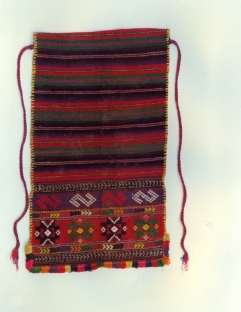 Μάλλινη υφαντή ριγωτή ποδιά. Στο κάτω μέρος διακόσμηση με ανθικά και γεωμετρικά μοτίβα σε παράλληλες ζώνες.