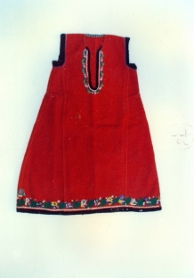 Μάλλινο αμάνικο κόκκινο φουστάνι με πολύχρωμη άνθινη διακόσμηση στον ποδόγυρο και στο άνοιγμα της τραχηλιάς.