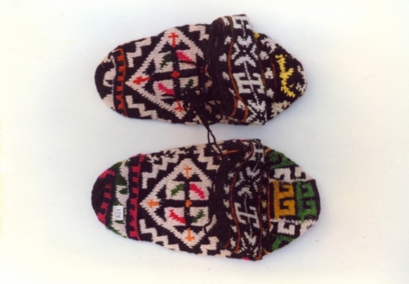 Πατούνες ή κοντοτσούραπα, σαρακατσάνικες μάλλινες πλεκτές με βελόνα με διάφορα γεωμετρικά μοτίβα και σχηματοποιημένο σταυρό. Θράκη.