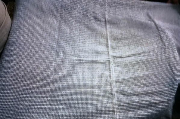 Κι είχαμε κάτι (γέλια) , τώρα βάζουμε μιας χρήσεως γάντια , εμείς τότε είχαμε «καπάκια» τα λέγαμε, για να μην μαυρίζουν τα χέρια μας , ήταν έτσι από εδώ (αγκώνα) έως εδώ (δάχτυλα). Ενιαίο ήταν το πανί και είχαμε μια δαχτυλήθρα εδώ στο μεσαίο δάχτυλο για να μην σηκώνεται συνέχεια και τα ‘χουμε με κλωστή ραμμένα ανάμεσα, αλλά και για να μην μας τσιμπούν τα άχυρα . Και στον καρπό ήταν με κλωστή δεμένο γύρω-γύρω».