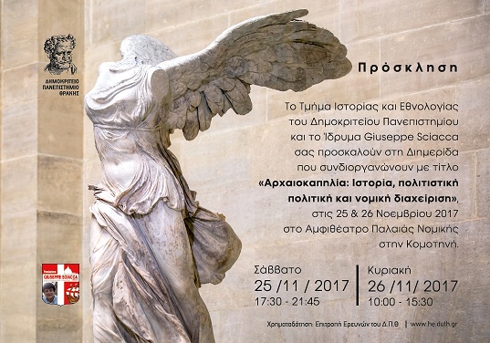 Το Τμήμα Ιστορίας και Εθνολογίας του Δημοκριτείου Πανεπιστημίου, σε συνεργασία με το Ίδρυμα Sciacca, διοργανώνει μια διημερίδα με θέμα Αρχαιοκαπηλία: Ιστορία, πολιτιστική πολιτική και νομική διαχείριση. Σκοπός της διημερίδας είναι να προσφερθεί στο ευρύτερο κοινό μια εικόνα των ιστορικών, αλλά και συγχρόνων διαστάσεων αυτού του προβλήματος το οποίο πλήττει την Ελλάδα ήδη πριν από την ίδρυση του ανεξάρτητου ελληνικού κράτους, ενώ σήμερα συνδυάζεται με το διεθνές έγκλημα και, πιο συγκεκριμένα, με τη χρηματοδότηση της τρομοκρατίας.