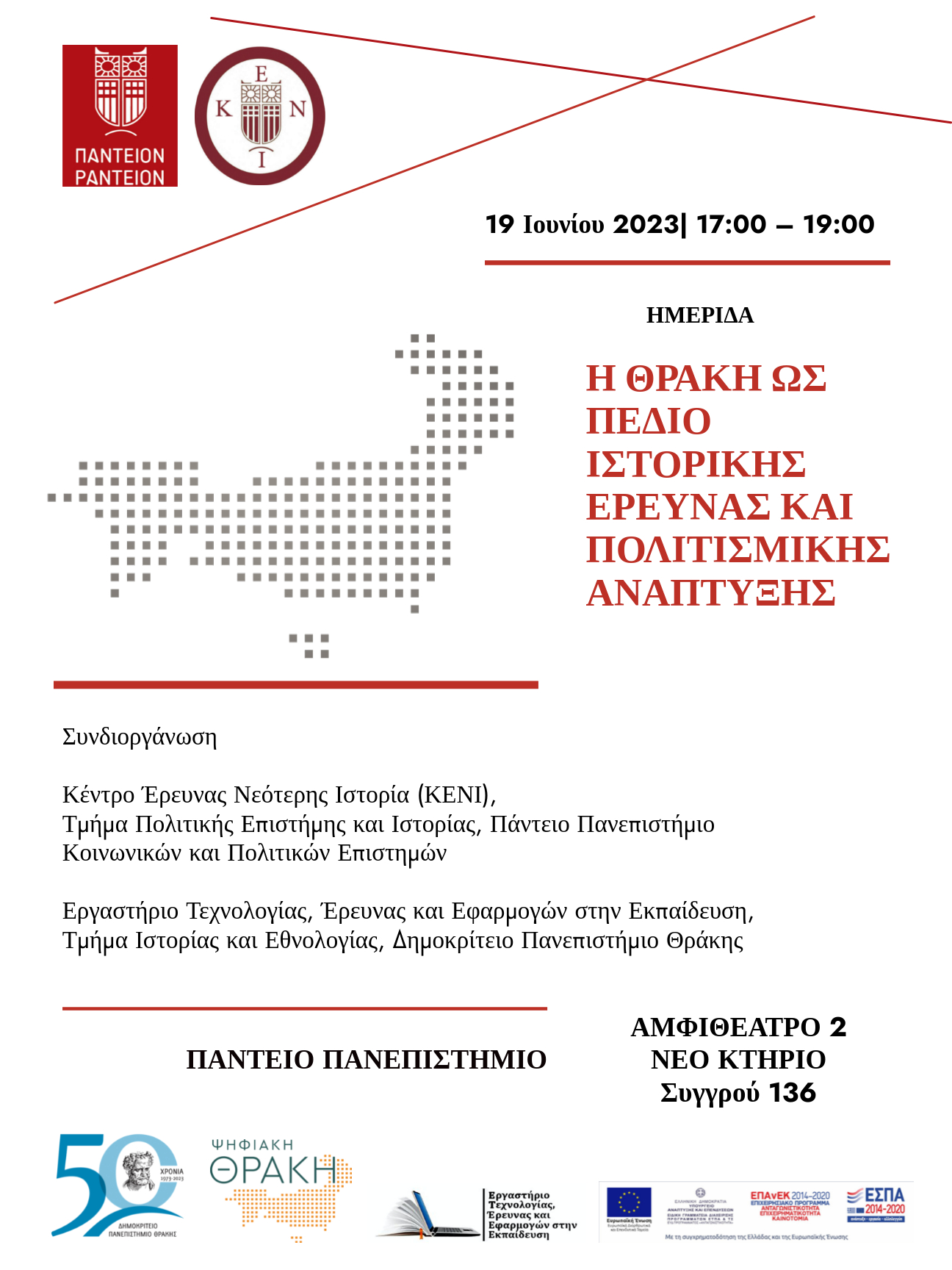 Το Εργαστήριο Τεχνολογίας, Έρευνας και Εφαρμογών στην Εκπαίδευση του Τμήματος Ιστορίας και Εθνολογίας του Δημοκρίτειου Πανεπιστημίου Θράκης σε συνεργασία με το Κέντρο Έρευνας Νεότερης Ιστορίας του Τμήματος Πολιτικής Επιστήμης και Ιστορίας του Παντείου Πανεπιστημίου διοργανώνουν Ημερίδα με θέμα «Η Θράκη ως πεδίο ιστορικής έρευνας και πολιτισμικής ανάπτυξης». Η εκδήλωση θα πραγματοποιηθεί στις 19 Ιουνίου 2023 και ώρες 17.00 – 19.00 στο Αμφιθέατρο 2 του Νέου Κτιρίου του Παντείου Πανεπιστημίου.