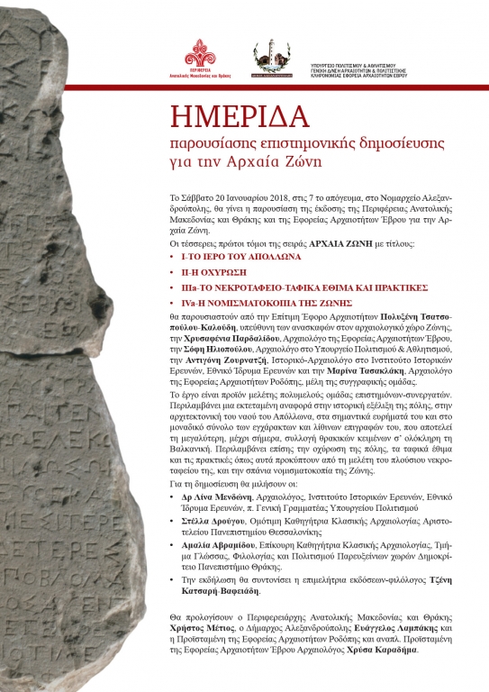Ημερίδα παρουσίασης επιστημονικής δημοσίευσης για την Αρχαία Ζώνη στο Νομαρχείο Αλεξανδρούπολης, 20.1.18., 19.00