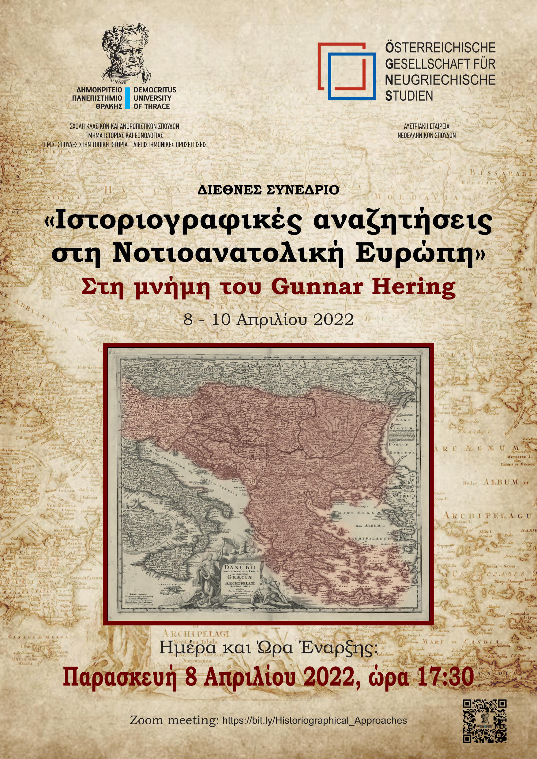 Το Πρόγραμμα Μεταπτυχιακών Σπουδών «Σπουδές στην Τοπική Ιστορία – Διεπιστημονικές Προσεγγίσεις» του Τμήματος Ιστορίας και Εθνολογίας της Σχολής Κλασικών και Ανθρωπιστικών Σπουδών του Δημοκρίτειου Πανεπιστημίου Θράκης σε συνεργασία με την Αυστριακή Εταιρεία Νεοελληνικών Σπουδών (Österreichische Gesellschaft für Neugriechische Studien) διοργανώνουν Διεθνές Συνέδριο με θέμα «Ιστοριογραφικές αναζητήσεις στη Νοτιοανατολική Ευρώπη» στη μνήμη του Καθηγητή Gunnar Hering.