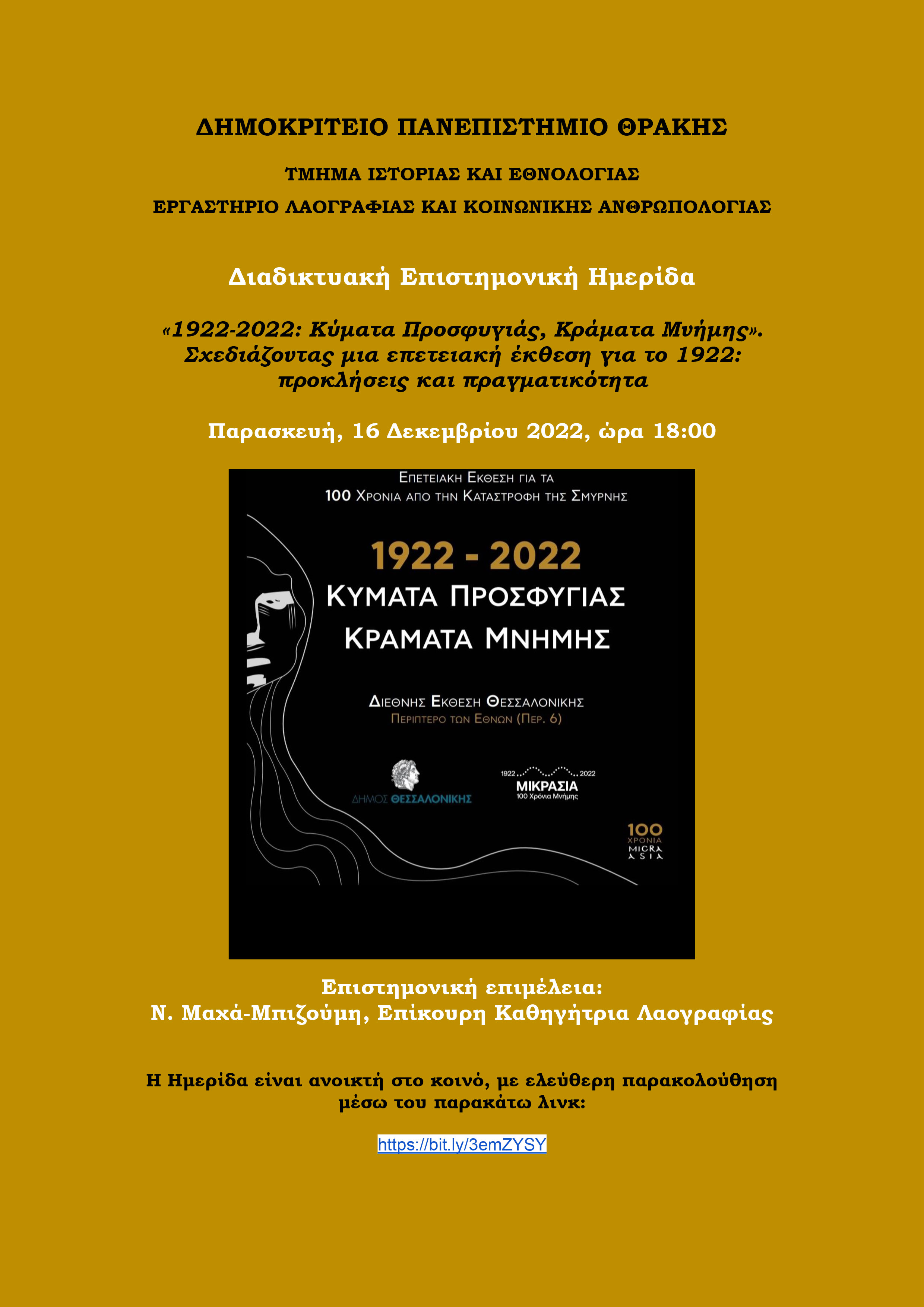 Διαδικτυακή Επιστημονική Ημερίδα: «1922-2022: Κύματα Προσφυγιάς, Κράματα Μνήμης». Σχεδιάζοντας μια επετειακή έκθεση για το 1922: προκλήσεις και πραγματικότητα