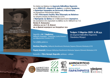 Στο πλαίσιο των δράσεων της Δημοτικής Βιβλιοθήκης Κομοτηνής και της ΚΟΙΝ.Σ.ΕΠ. «Κομοτηνή Εν Δράσει», οι εκδόσεις Υψικάμινος, το Εργαστήριο Λαογραφίας και Κοινωνικής Ανθρωπολογίας του Δημοκρίτειου Πανεπιστημίου Θράκης, το ΠΜΣ «Πολιτισμικές Σπουδές: Νέος Ελληνισμός και Βαλκάνια» του Τμήματος Ιστορίας και Εθνολογίας του Δ.Π.Θ., ο Παρατηρητής της Θράκης και το Βιβλιοχαρτοπωλείο Δημοκρίτειο σας προσκαλούν στην παρουσίαση του βιβλίου του Επ. Καθηγητή του Τ.Ι.Ε. Θανάση Β. Κούγκουλου